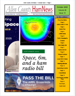 The October 2025 issue of Allen County HamNews, our official newsletter, is available for download using the link below or the “Newsletters” menu item at the top of our web pages.